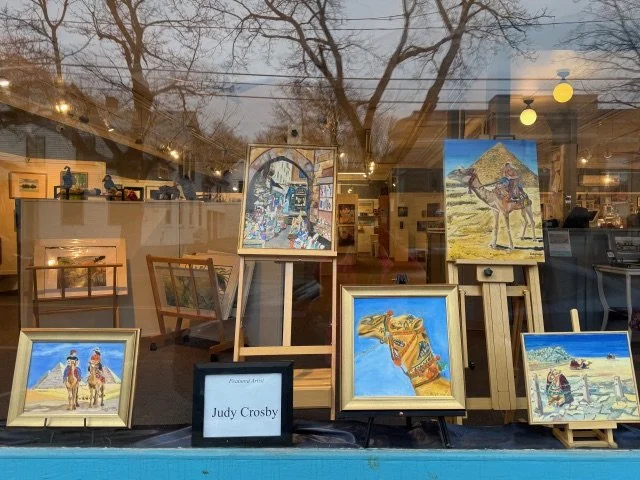 Egypt has fascinated me since I was a child. I grew up to teach weeklong summer sessions on Ancient Egypt. Finally in 2024 my husband and I went to Egypt, sailed the Nile, visited the pyramids, and the Valley of the Kings and explored Cairo. This collection “Journey to Egypt” was inspired by that trip. These paintings are featured in the 302 Gallery’s front window at 112 Main St., Bridgton, ME from April 19- May 3, 2026.